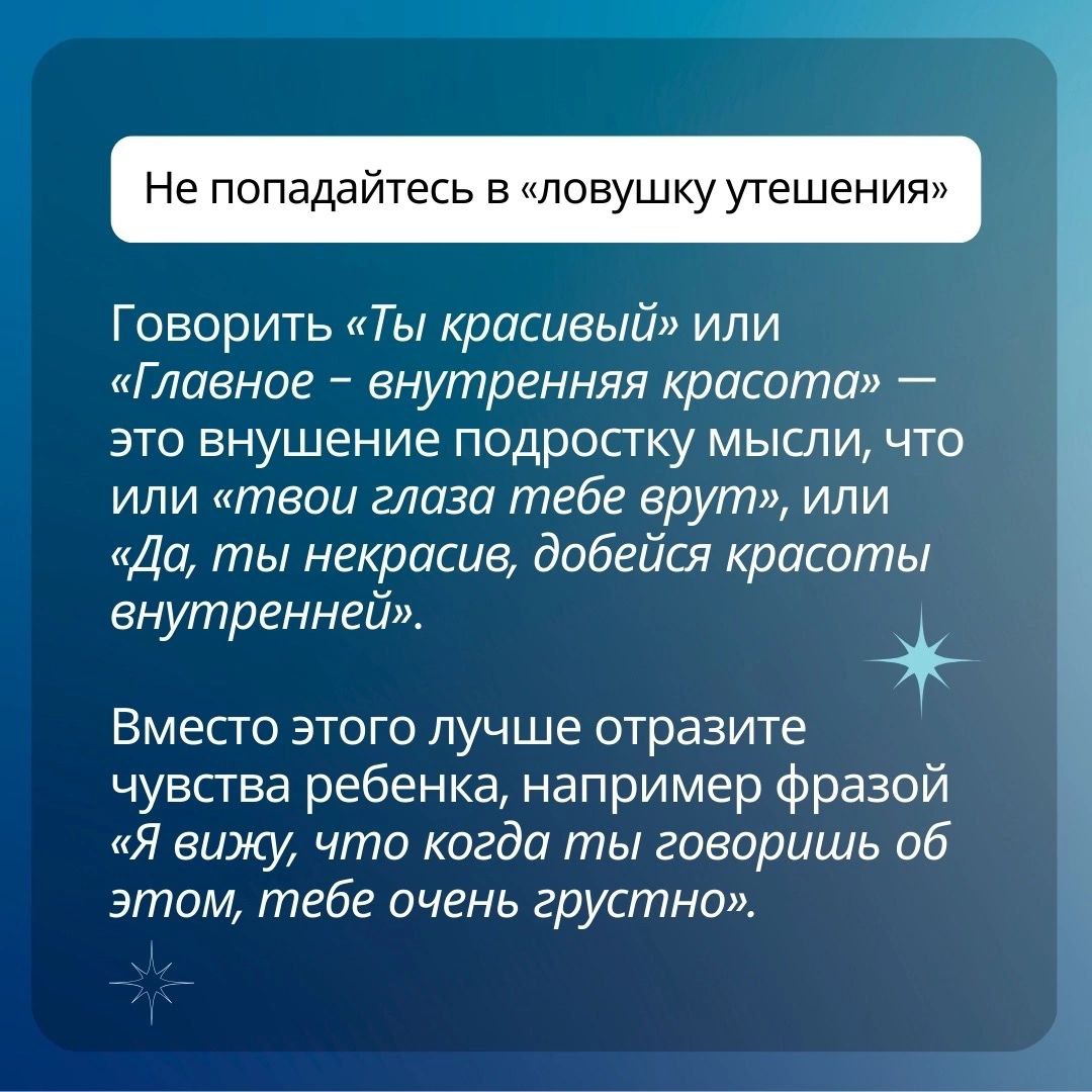 1. Не попадайтесь в «ловушку утешения». Говорить «ты красивый» или «главное - внутренняя красота» — это внушение подростку мысли, что или «твои глаза тебе врут», или "да, ты некрасив, добейся красоты внутренней". Вместо этого лучше отразите чувства ребенка, например фразой «Я вижу, что когда ты говоришь об этом, тебе очень грустно»;