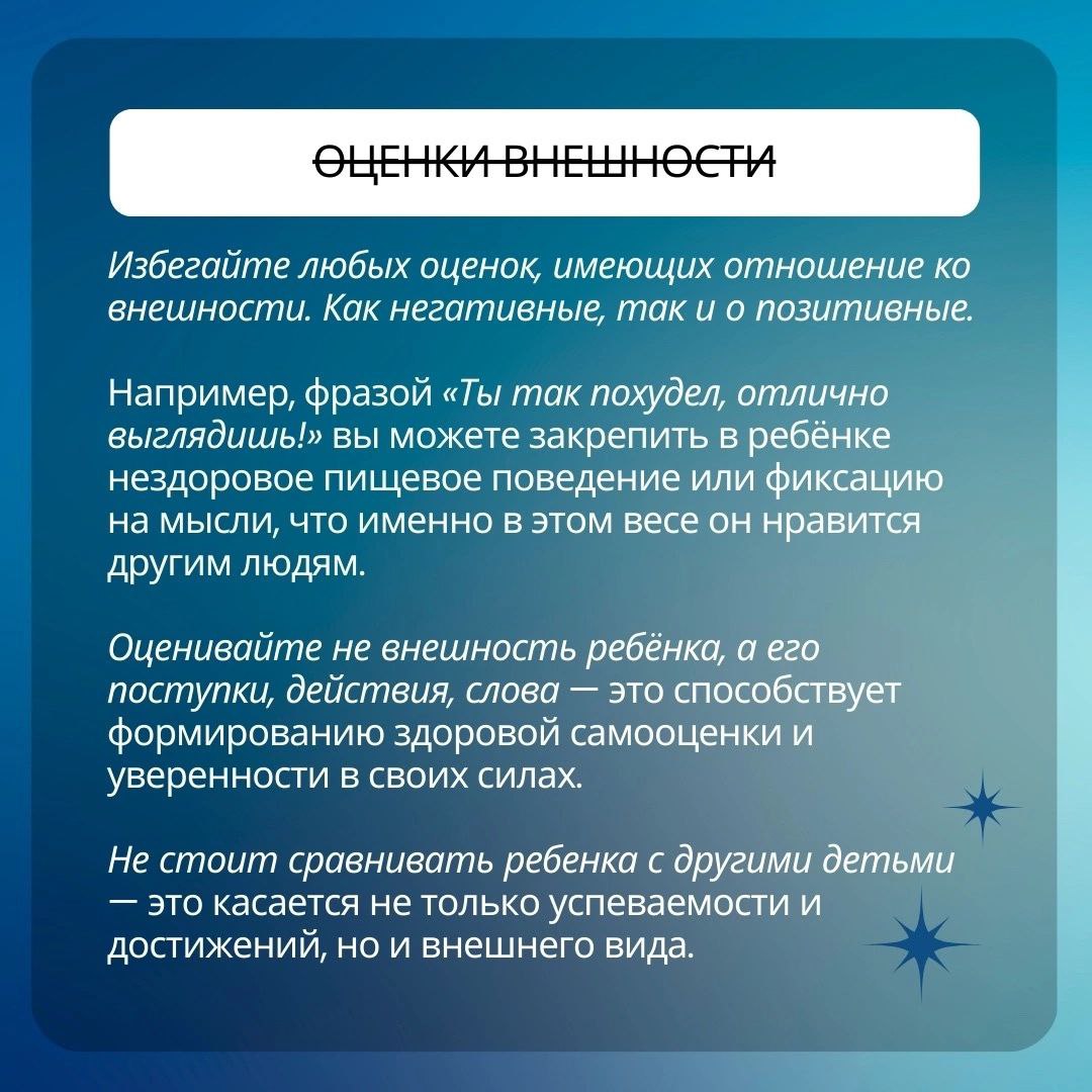 3. Избегайте любых оценок, имеющих отношение ко внешности. Причем речь идет как о негативных, так и о позитивных оценках. Например, фразой «Ты так похудел, отлично выглядишь!» вы можете закрепить в ребенке нездоровое пищевое поведение или фиксацию на мысли, что именно в этом весе он нравится другим людям. Оценивайте не внешность ребенка, а его поступки, действия, слова — это способствует формированию здоровой самооценки и уверенности в своих силах. Также не стоит сравнивать ребенка с другими детьми — это касается не только успеваемости и достижений, но и внешнего вида;