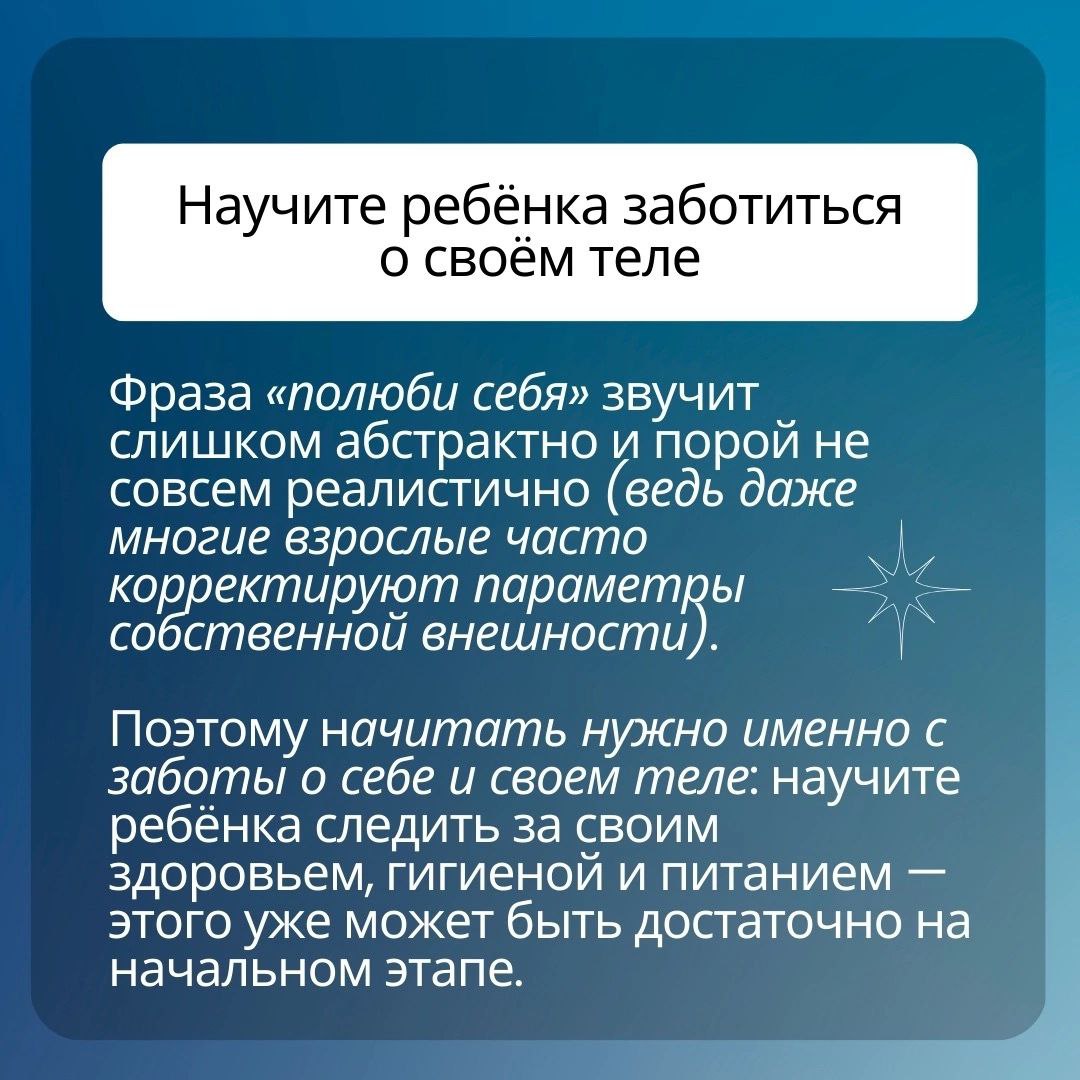 5. Научите ребенка заботиться о своем теле. Расхожая фраза «полюби себя» звучит слишком абстрактно и порой не совсем реалистично (ведь даже многие взрослые часто корректируют параметры собственной внешности). Поэтому начитать нужно именно с заботы о себе и своем теле: научите ребенка следить за своим здоровьем, гигиеной и питанием — этого уже может быть достаточно на начальном этапе.